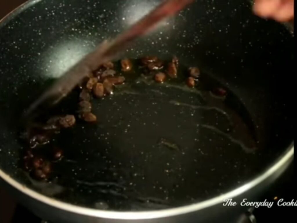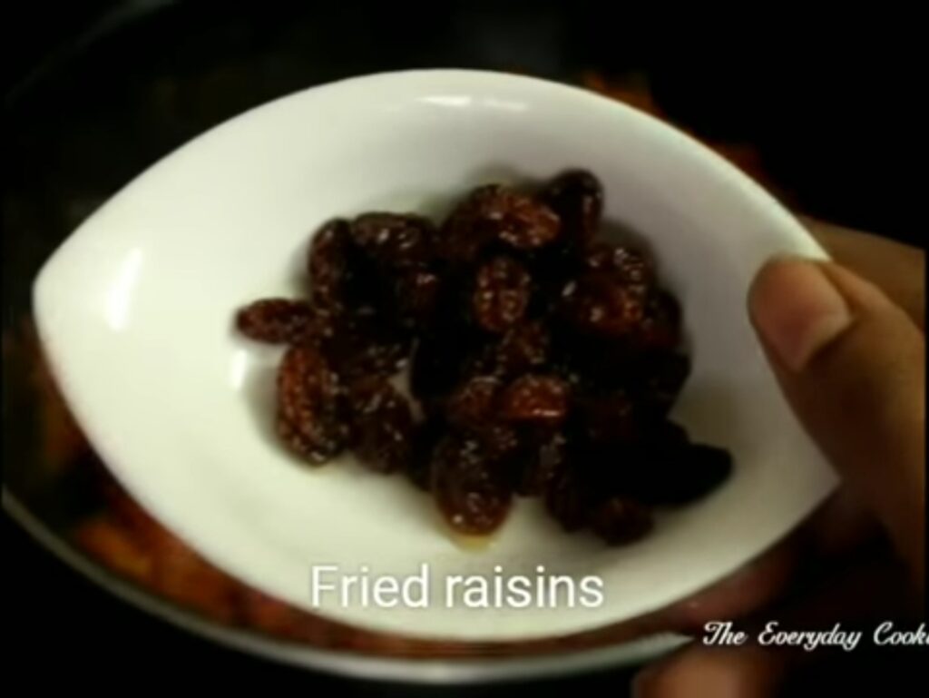 - Add a tsp of ghee in a pan and fry the raisins, take them out and set aside.