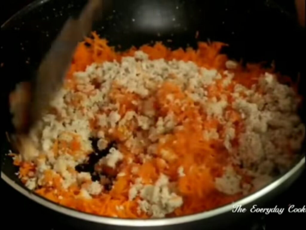 - Transfer the carrot coconut mixture into a bowl. Let it cool down a little bit.