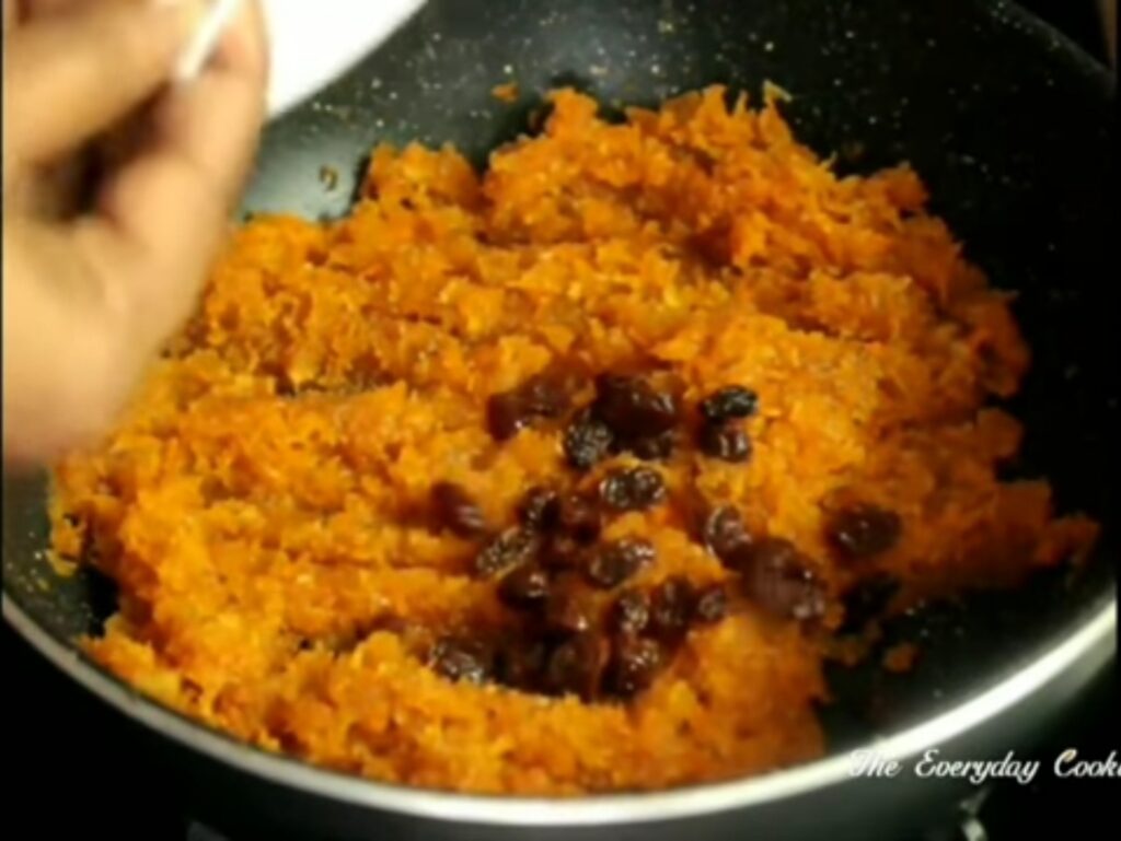 Step 5: Add the cardamom powder and the fried raisins. Give a nice saute for few minutes until the carrots get completely cooked.