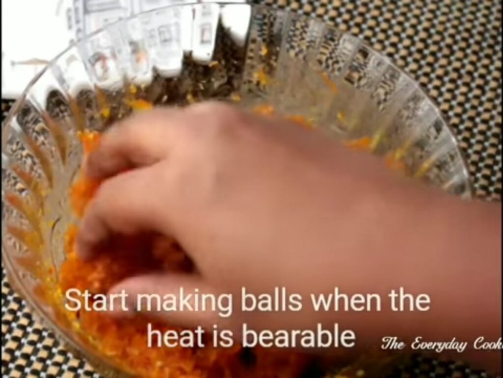 Step 8: Once the heat is bearable, make small balls out of it. Our laddu is ready.