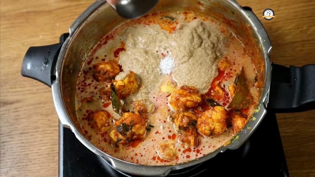 • Add the prepared masala paste and water as needed for consistency. Adjust salt if needed. Close the pressure cooker and cook for 3-4 whistles, until the chicken is tender.