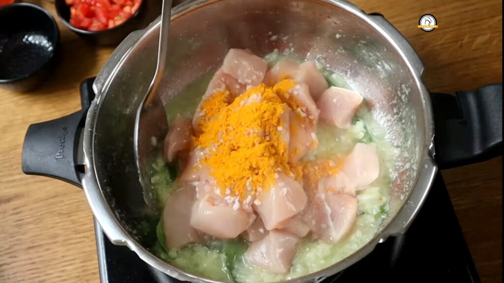 • Add 500g chicken pieces, 1/2 tsp turmeric powder, and salt. Sauté until the chicken turns white.