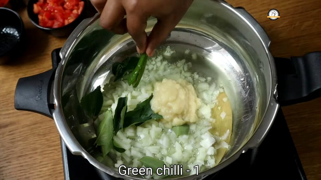 • In a pressure cooker, heat oil. Add 1 bay leaf, 1 cup chopped onions, curry leaves, and 2 tbsp ginger garlic paste. Sauté until onions turn golden brown.