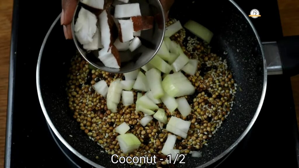 • Add 1 chopped onion and 1/2 grated coconut to the pan. Sauté the mixture until the onions become translucent.