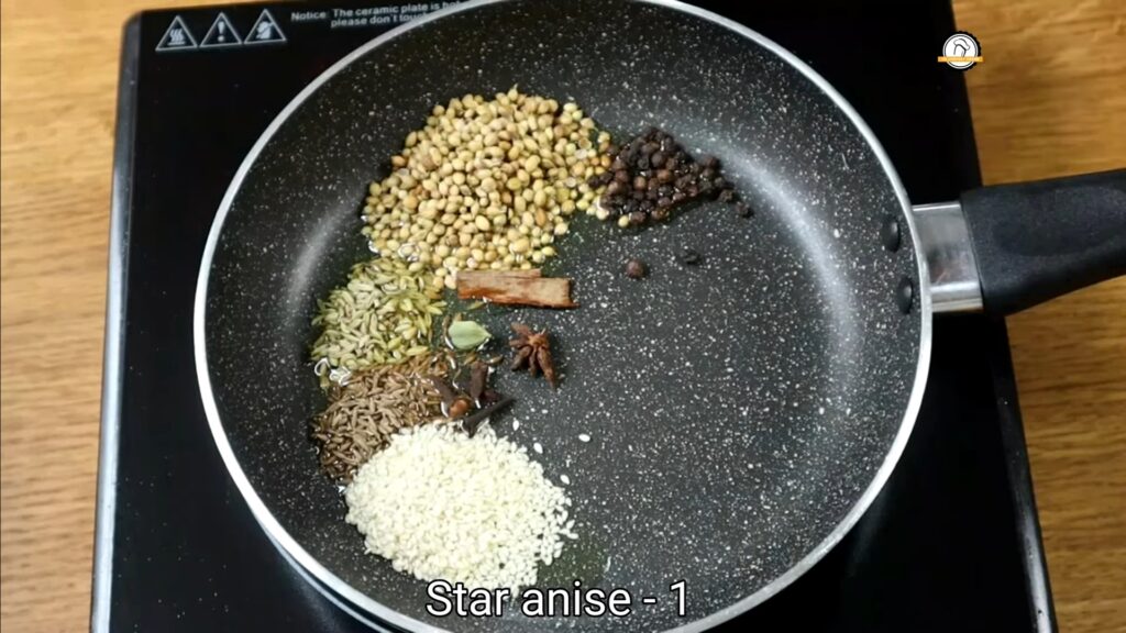 • Heat 1 tsp oil in a pan on low flame. Add 1 tsp each of cumin seeds, fennel seeds, coriander seeds, peppercorns, sesame seeds, 1 cardamom, 4-5 cloves, and 1 star anise. Roast until fragrant.