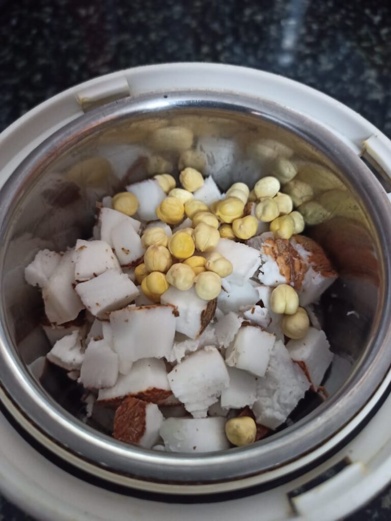 6. Add enough water and grind the coconut and fried gram into a thick paste.