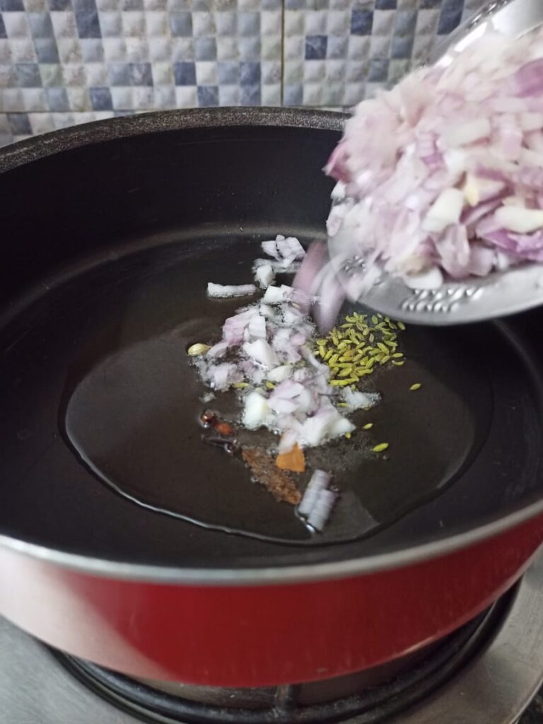 1.Heat some oil in a pan and add the whole spices, cardamom, cinnamon, cloves and fennel seeds.