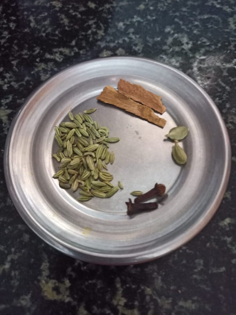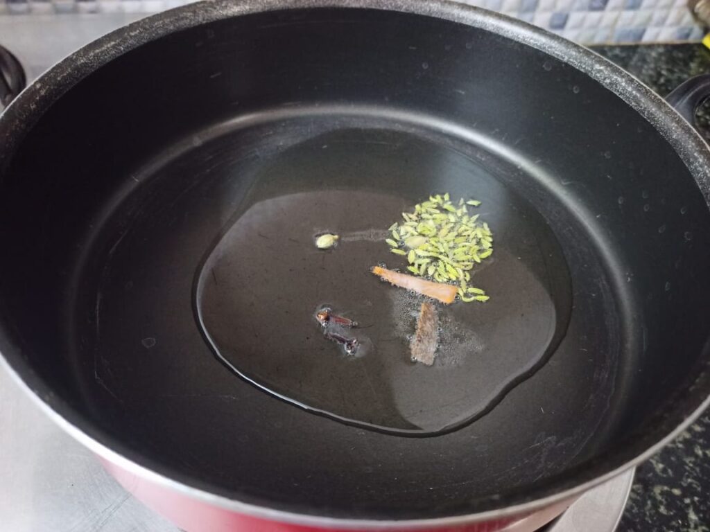 • Heat some oil in a pan and add the whole spices, cardamom, cinnamon, cloves and fennel seeds.