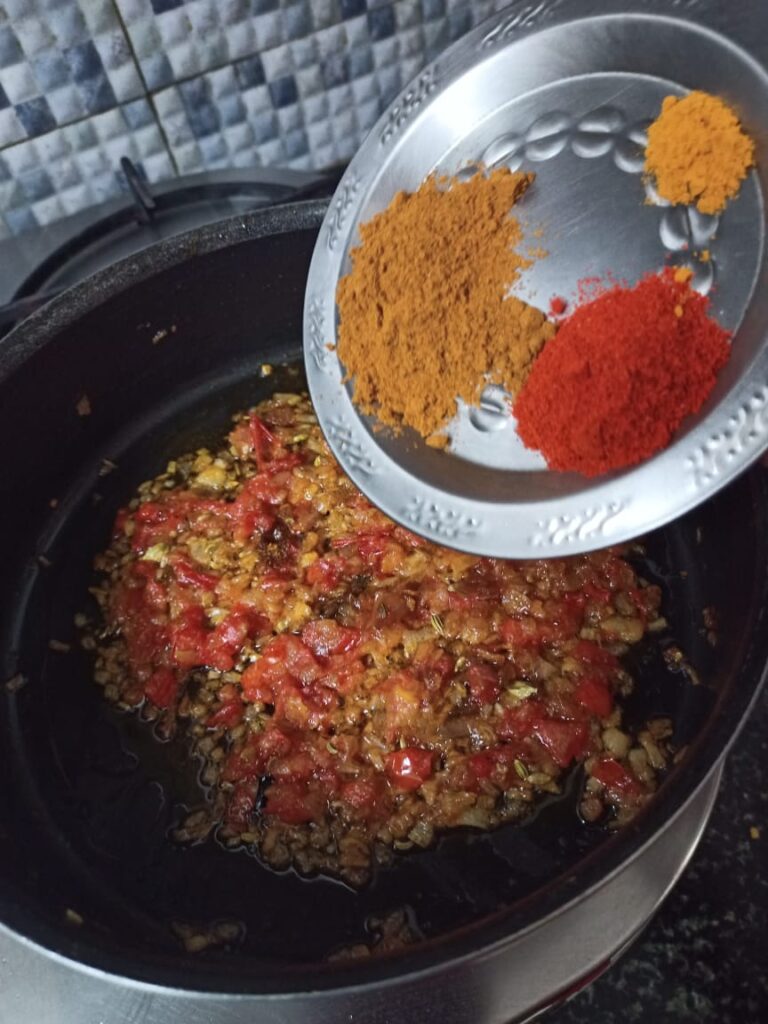 • Add chilli powder, coriander powder and turmeric powder and saute everything well until oil oozes out.