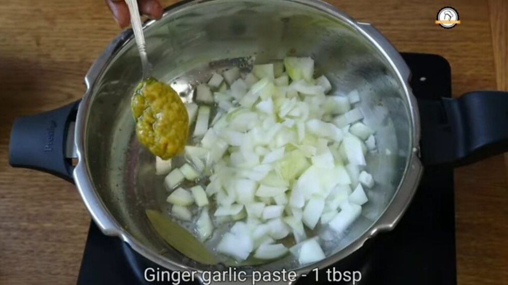 - In the same cooker add some oil, 2 bay leaves, 1 cup of onions, and 1 tbsp of ginger garlic paste. Sauté until onions turn translucent.