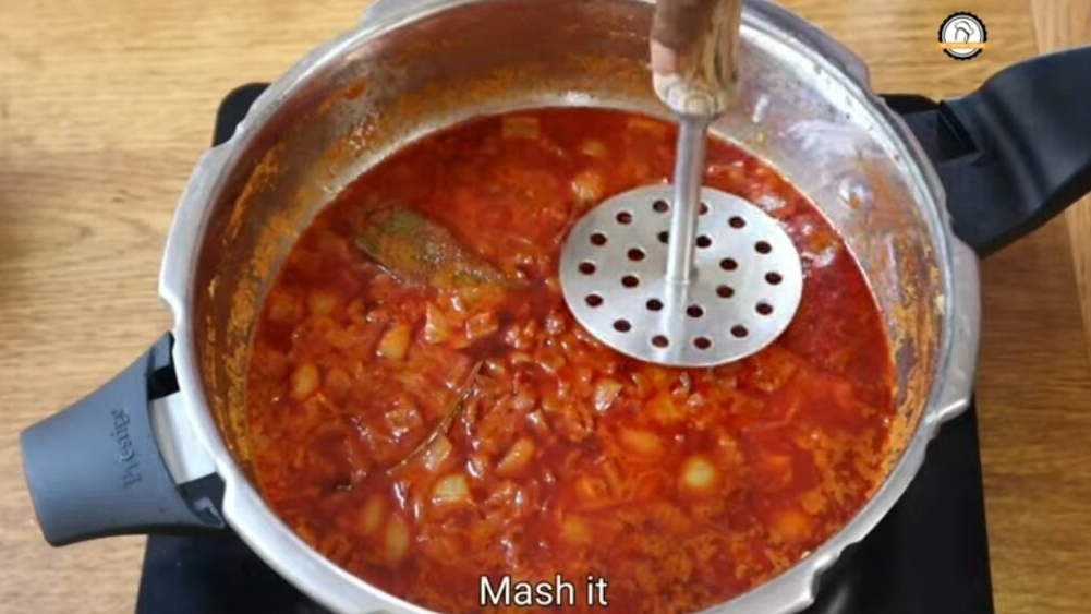- Mash the curry with a potato masher and add the prepared soya chunks and 1/2 cup of water.