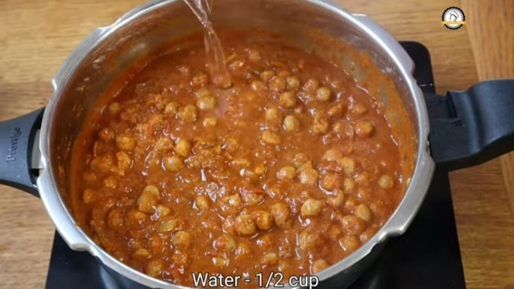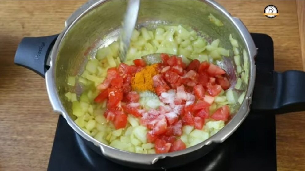 - Add 1 cup of finely chopped tomatoes to the cooker, along with salt to taste and 1/2 teaspoon of turmeric powder.