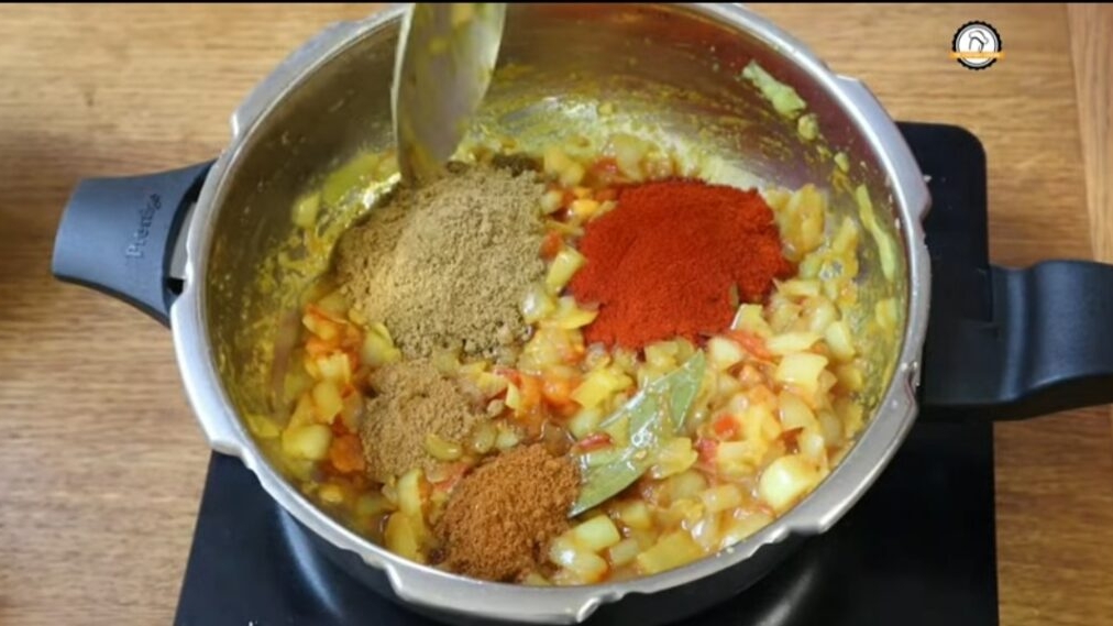 - Mix well and sauté the mixture for about 2 minutes, ensuring that the raw aroma of the spices dissipates. Stir continuously to prevent the spices from burning.
