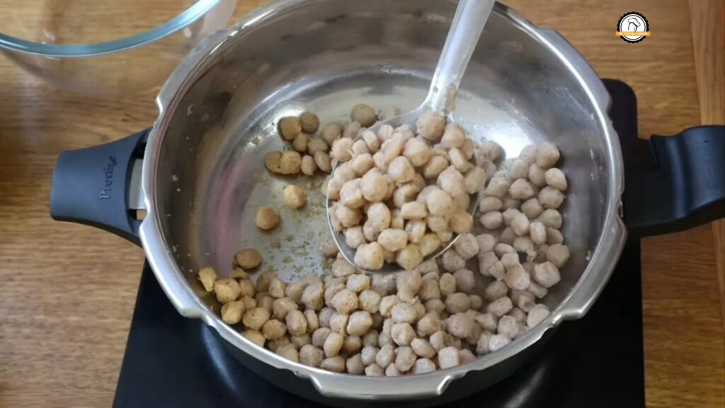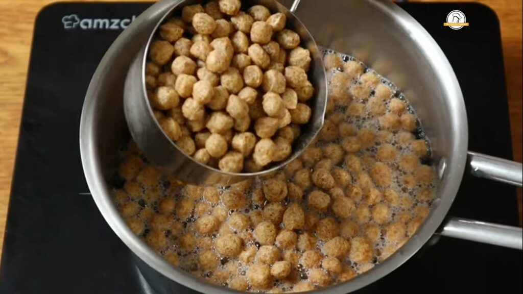 - Add 2 cups of soya chunks and boil for 1 or 2 mins.
