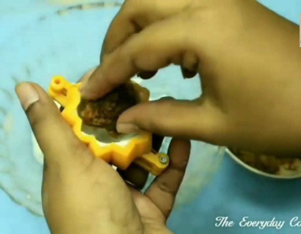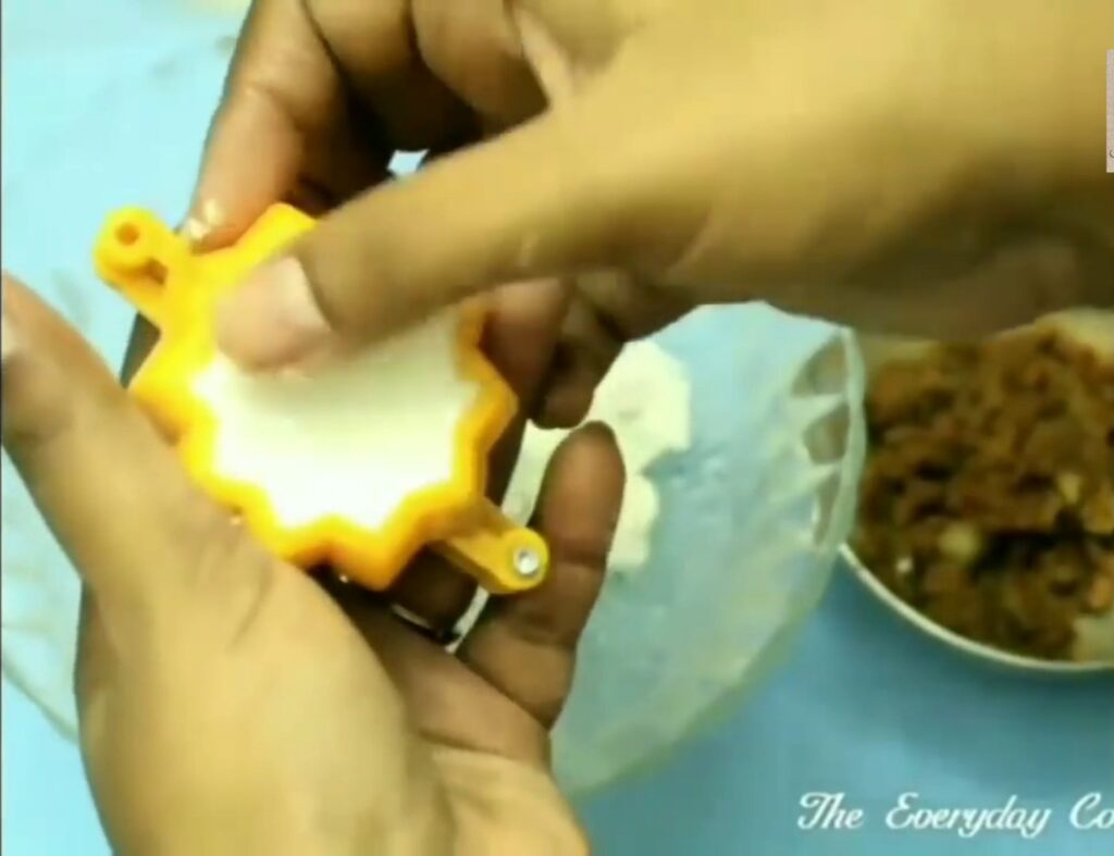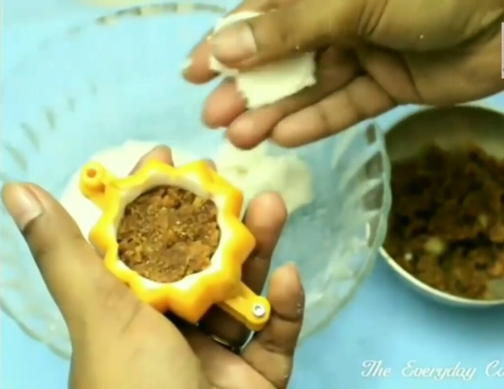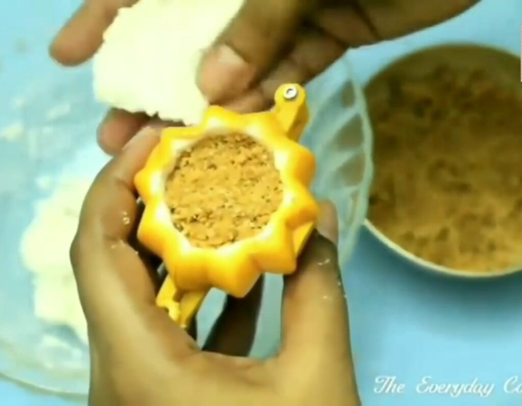 - Grease the mold with oil.Take the prepared rice flour dough and spread it in the mold , leave some space in the middle for the stuffings. Now fill the stuffing inside and close it with dough. Now this is ready to be steamed.