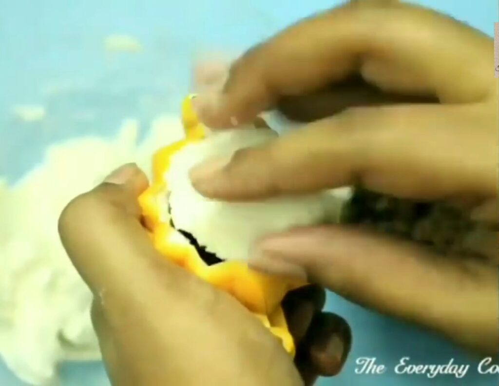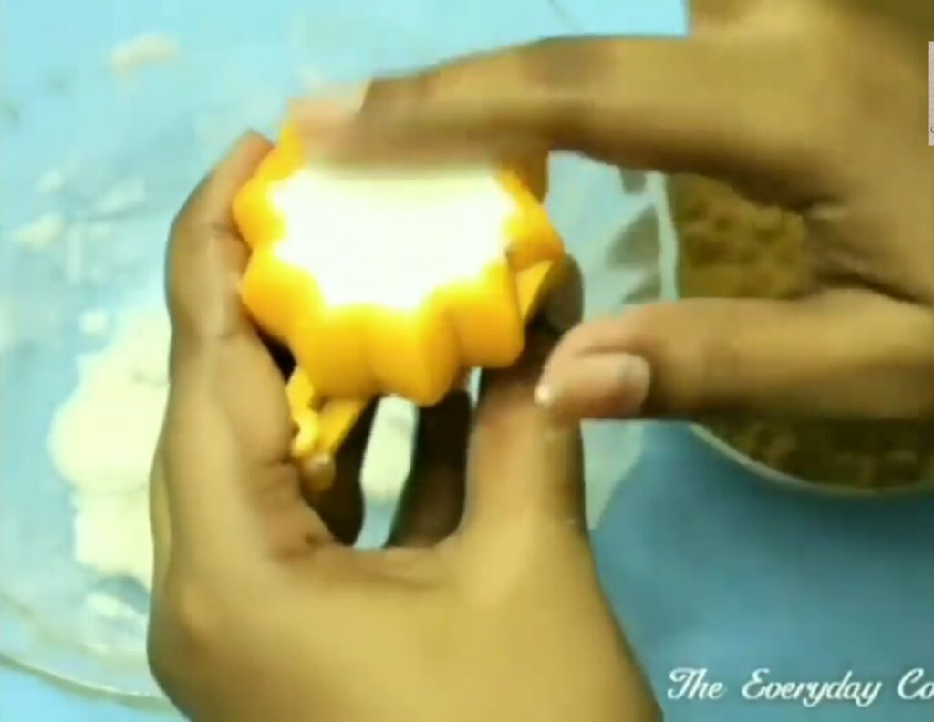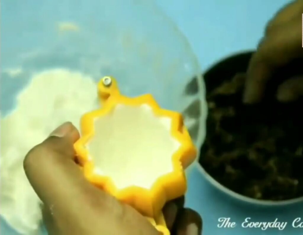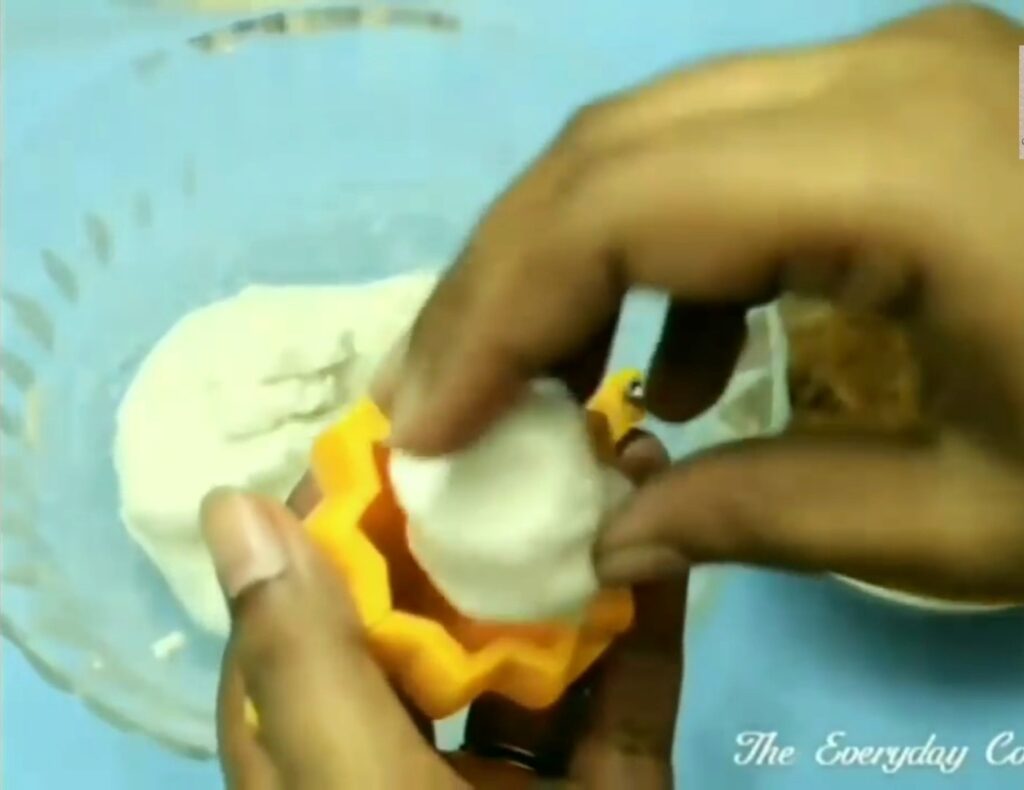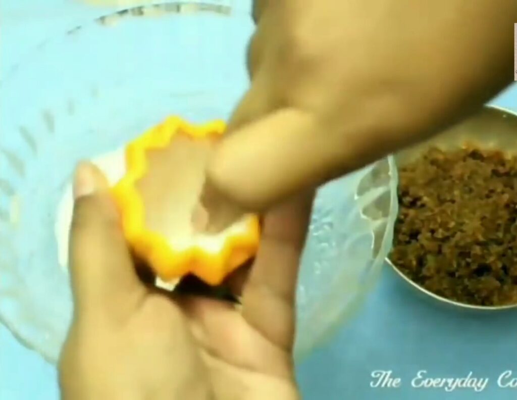 - Grease the mold with oil.Take the prepared rice flour dough and spread it in the mold , leave some space in the middle for the stuffings. Now fill the stuffing inside and close it with dough. Now this is ready to be steamed.