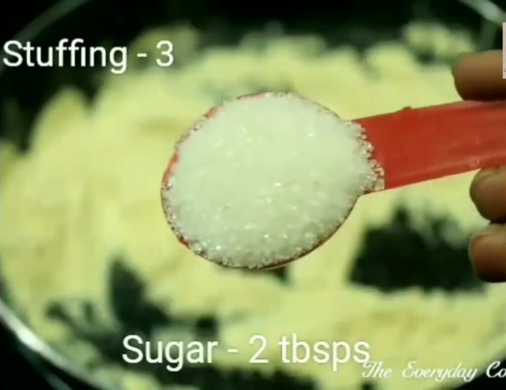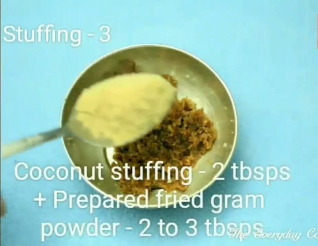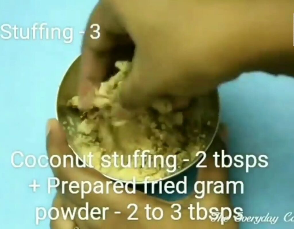 4. Here i have taken 2 tbsp of fried gram powder stuffing we prepared along with coconut jaggery stuffing.