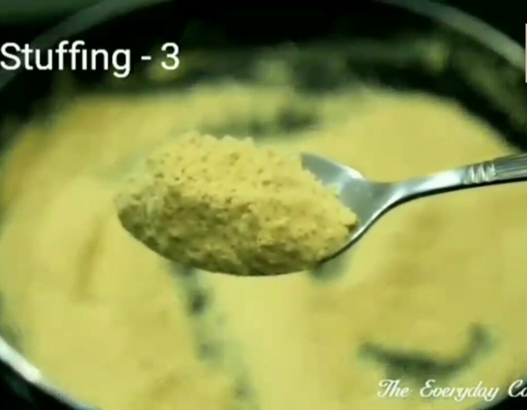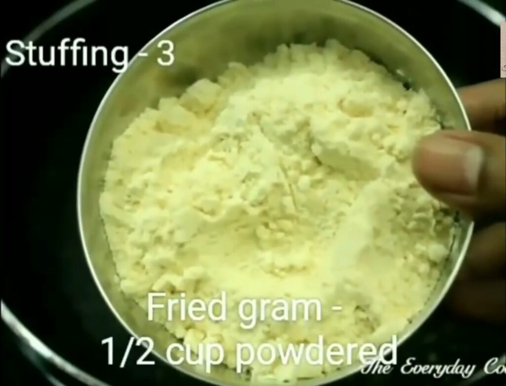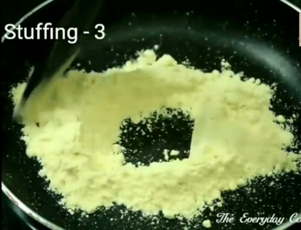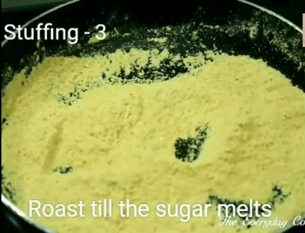 - Saute it well for 2 mins. we can use it as a stuffing directly or mix it with our first stuffing ( jaggery +coconut) with this. Here I have taken 2 tbsps of fried gram powder stuffing we prepared along with coconut jaggery stuffing. Now our third stuffing is ready.