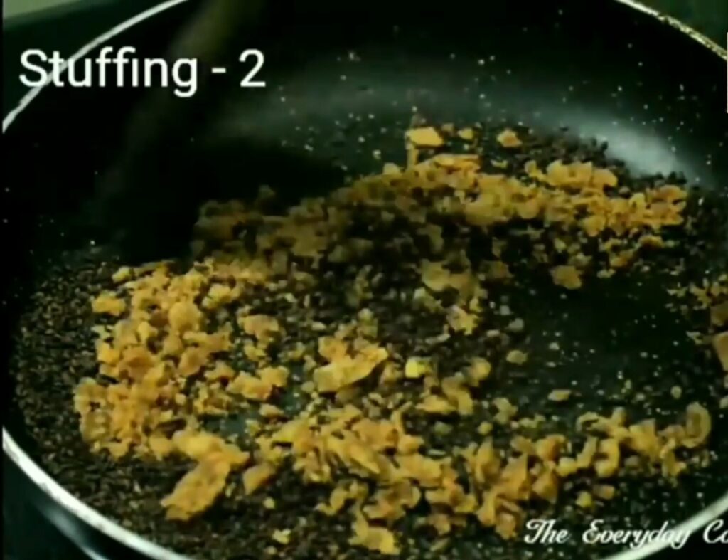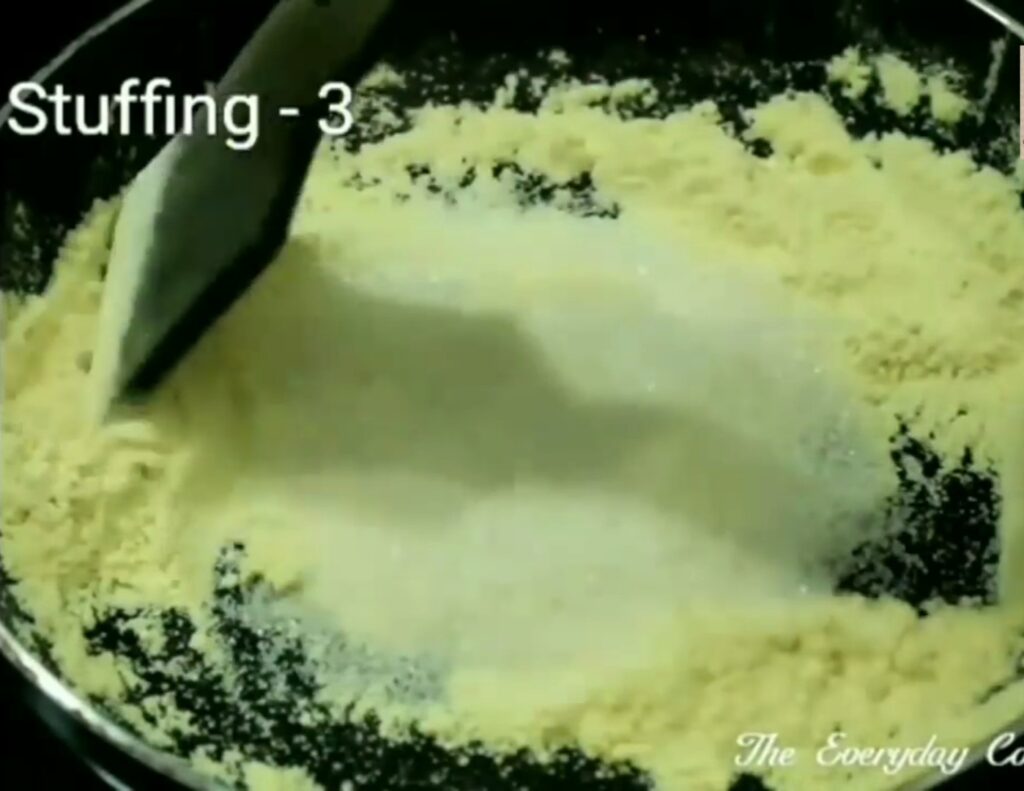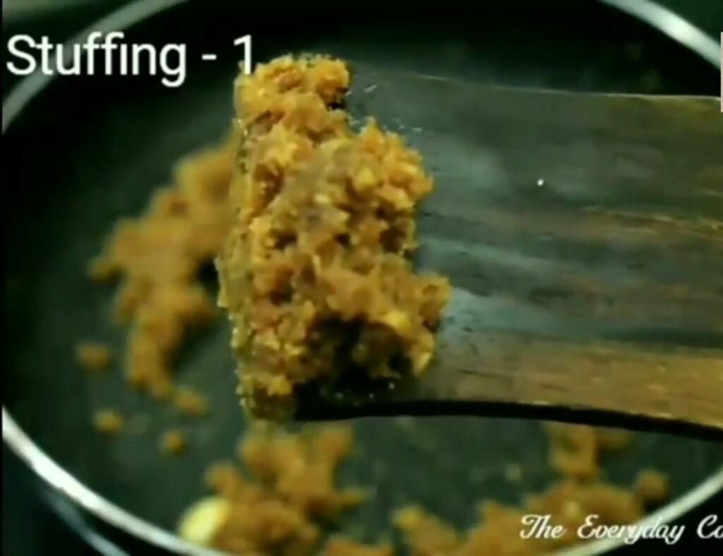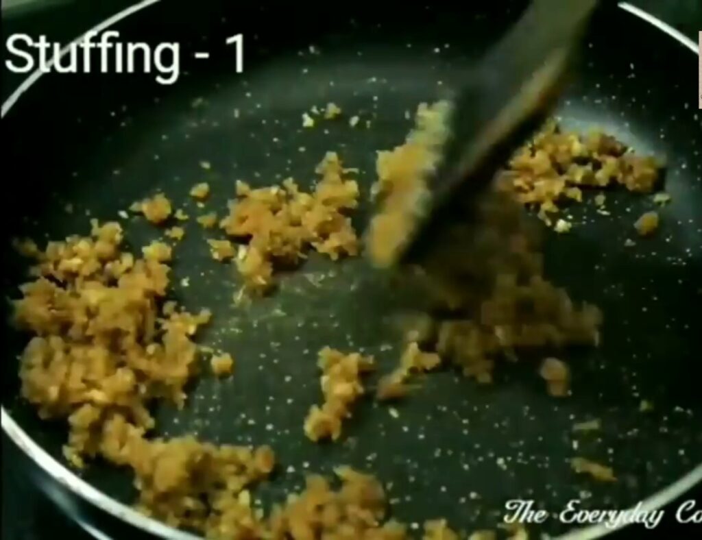 - Saute it well for 2 mins. we can use it as a stuffing directly or mix it with our first stuffing ( jaggery +coconut) with this. Here I have taken 2 tbsps of fried gram powder stuffing we prepared along with coconut jaggery stuffing. Now our third stuffing is ready.