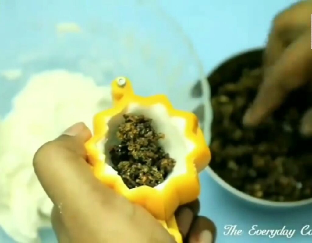 - Following the same procedure as first and second stuffing, grease the mold and fill the dough and stuffing.