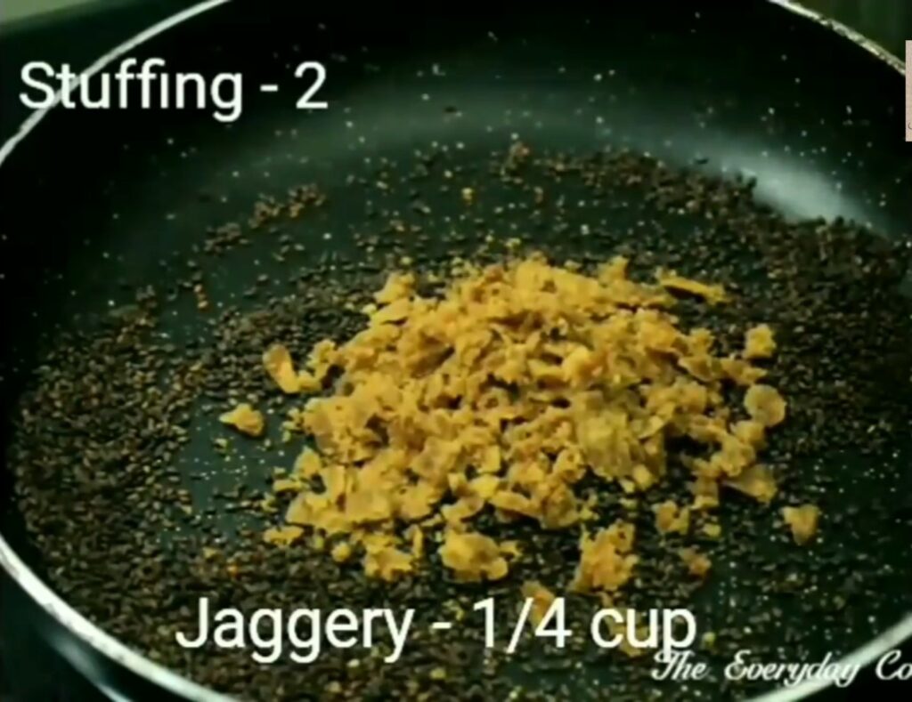 - Now add the jaggery to this and saute. Switch off the flame when the jaggery melts and everything is mixed well. Our second stuffing is ready now.