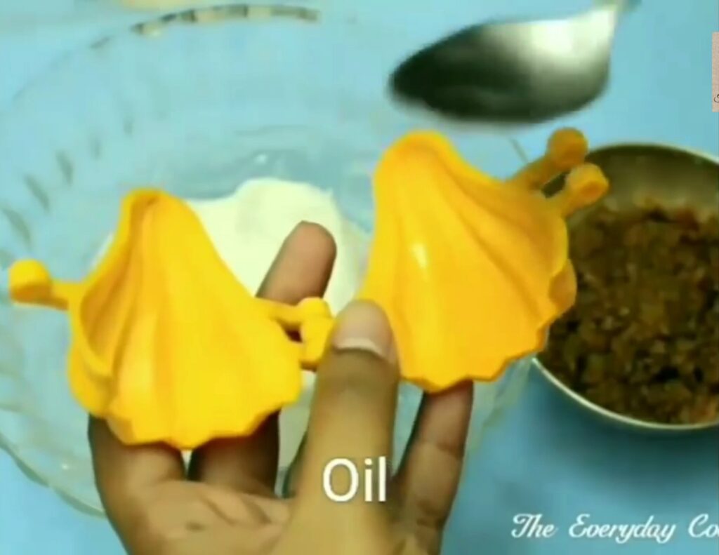 - Grease the mold with oil . Take the prepared rice flour dough and spread it in the mold , leave some space in the middle for the stuffings.