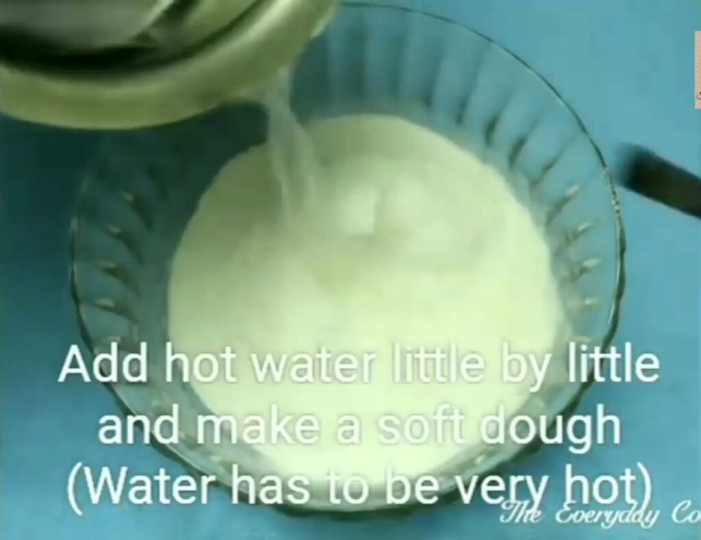 2. Add hot water little by little and mix it with a spatula to make a soft dough.